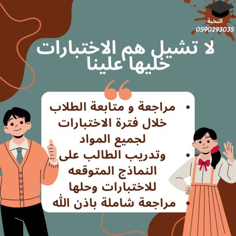 مع دروس خصوصية مخصصة، أضمن لك تحسن في مستوى ابنك مع الوقت. تواصل معي وأشوف كيف أقدر أساعده في تأسيس صح قوي لتفوقه الدراسي 0590293035